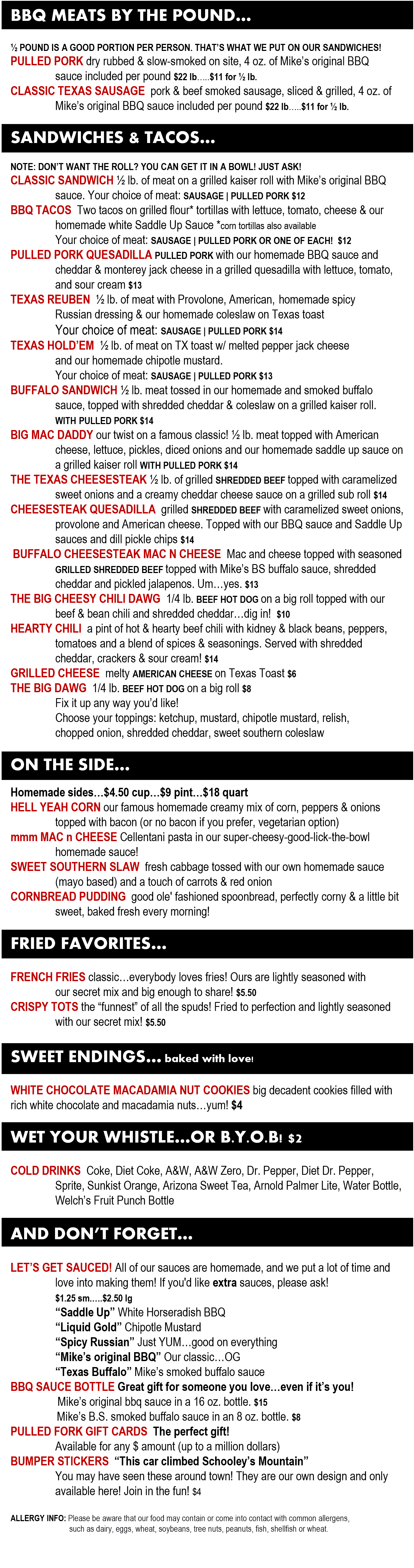 We feature Pulled Pork, Chopped Brisket, Pulled Chicken, and Texas Sausage on a rotating basis (please check the daily menu) We also offer a variety of featured specials including sandwiches, hot dogs, fried chicken & shrimp tacos, quesadillas and more! Our homemade sides include our famous hell yeah corn, mac & cheese, cornbread pudding, coleslaw, and beans. We offer a rotating variety of fries, tots, and onion rings. Homemade dessert options are available every day!