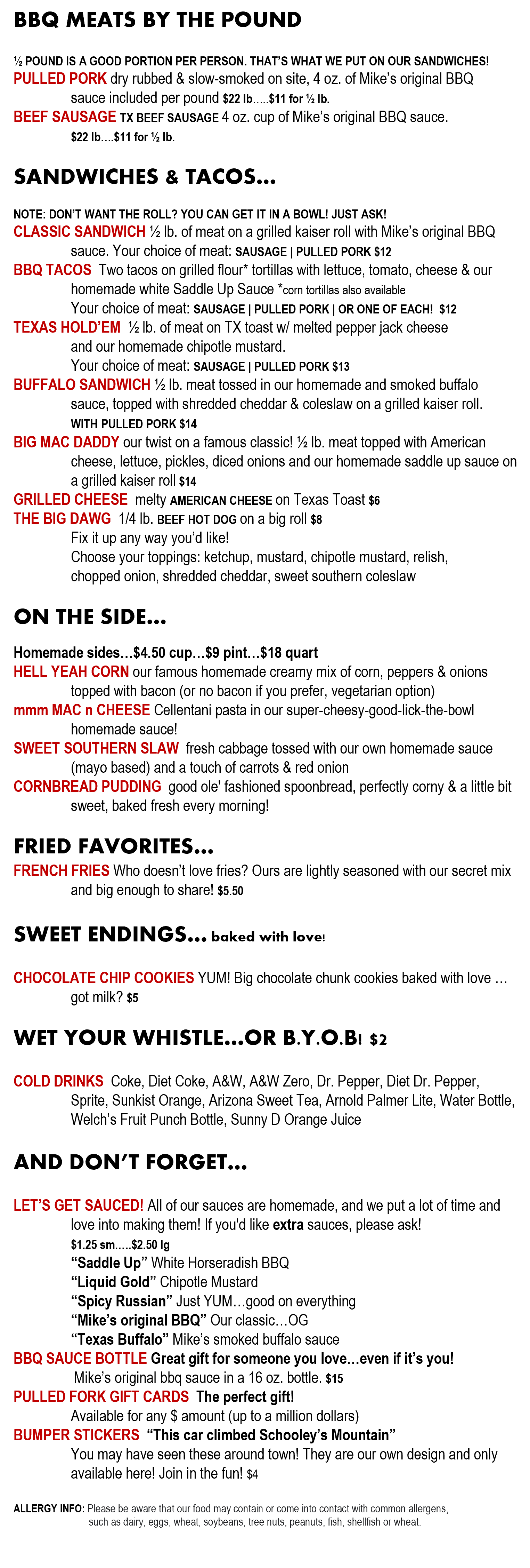We feature Pulled Pork and Texas Sausage daily, and Chopped Brisket, Pulled Chicken, and Smoked Wings Fridays & Saturdays on a rotating basis (please check the daily menu). We also offer a rotating variety of featured specials including sandwiches, hot dogs, fried chicken, fried fish & fried shrimp tacos, quesadillas and more! Our homemade sides include our famous hell yeah corn, mac & cheese, cornbread pudding, coleslaw, and beans. We offer a rotating variety of fries, tots, and onion rings. Homemade dessert options are available every day!