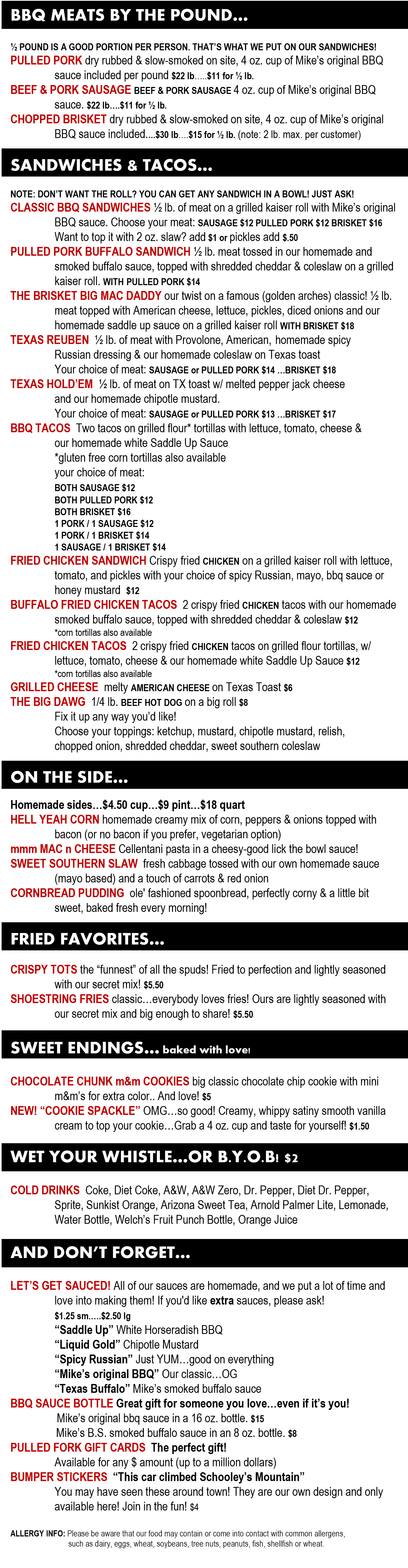 Our BBQ goes fast, so we like to offer it to the folks at the door, on a first come first served basis. We open at 11:00 a.m. and close when we sell out, and that time varies! We post our closing time daily on our website & on our chalkboard sign, so please check before you come down!